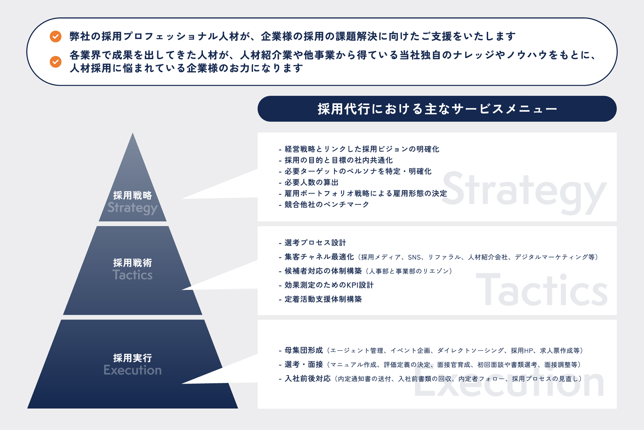 当社における主なご支援内容です。 御社のニーズや採用課題に応じて、下記以外にも柔軟に対応致します。