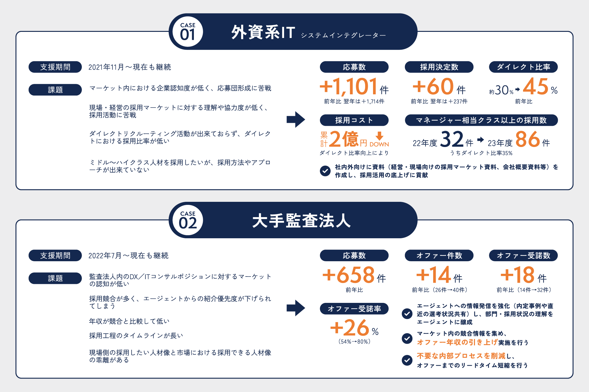 採用戦略・ブランディング・母集団形成・エージェント連携・ダイレクト採用まで総合変革支援。 当社では、採用領域に精通したプロフェッショナル人材が、貴社の採用課題に対して戦略的かつ実行力あるご支援を提供いたします。単なる工数カバーにとどまらず、経営戦略と連動した「採用ビジョン」の設計からスタートし、エージェント事業・コンサルティング事業で培った独自ナレッジを活かして、持続可能な採用体制の構築を実現します。継続支援中の企業様が多いため、公開できる情報は一部に限られますが、ぜひ支援実績をご覧ください。